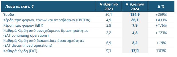Η σημαντική αύξηση όλων των ενοποιημένων βασικών οικονομικών μεγεθών προέρχεται από την οργανική ανάπτυξη των εταιρειών Πληροφορικής και από την προσθήκη στο α' εξάμηνο 2024 των αποτελεσμάτων της εταιρείας Αττικά Πολυκαταστήματα, η οποία αποκτήθηκε την 01.09.2023. Στις διακοπείσες δραστηριότητες περιλαμβάνεται ο τομέας της Βιομηχανίας, τον οποίο η Εταιρεία μεταβίβασε την 06.08.2024 έναντι τιμήματος € 115,5 εκατ., με εκτιμώμενη καθαρή κερδοφορία € 74 εκατ.