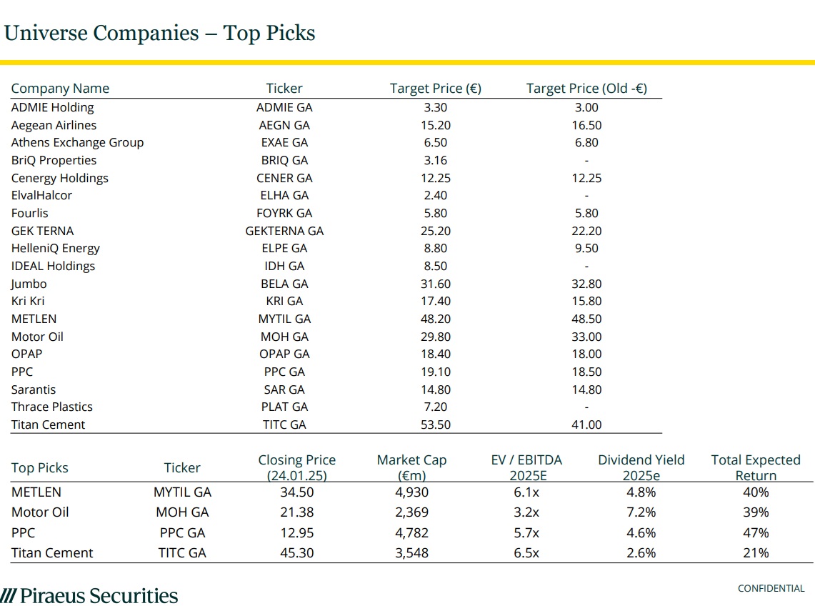Στην πρόσφατη έκθεσή της η χρηματιστηριακή ανέφερε πως για το 2025 έχει μία συγκρατημένα αισιόδοξη άποψη εν μέσω ενός αβέβαιου παγκόσμιου περιβάλλοντος, αναμένοντας ότι το Χ.Α θα συνεχίσει να υπεραποδίδει χάρη στον υψηλότερο από τον μέσο ρυθμό αύξησης του ΑΕΠ στην περιοχή της ευρωζώνης και την ευνοϊκή αποτίμηση (P/E 9,7 φορές τα εκτιμώμενα κέρδη του 2025).