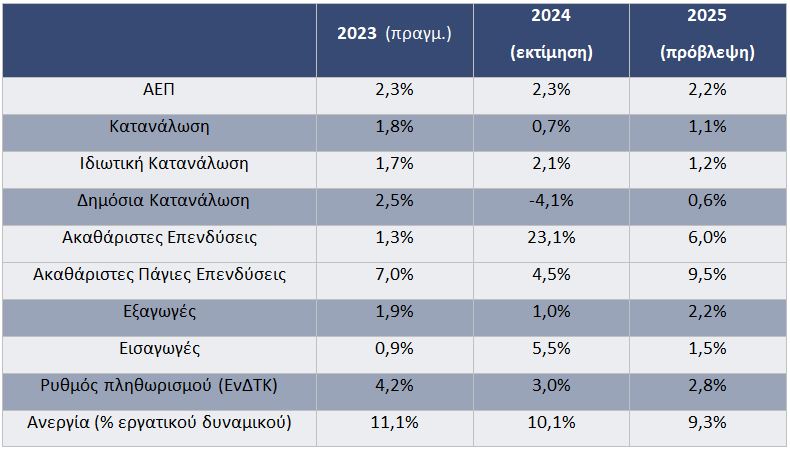 Το έλλειμμα στο εξωτερικό ισοζύγιο αναμένεται να μειωθεί, αν και σε υψηλά επίπεδα, με τις εξαγωγές και τις εισαγωγές να αυξάνονται ετησίως κατά +2,2% και +1,5% αντιστοίχως. Σημαντικοί κίνδυνοι απορρέουν από τον χαμηλότερο ρυθμό ανάπτυξης της οικονομίας της Ευρωζώνης, την όξυνση της οικονομικής αβεβαιότητας σε περιφερειακό και διεθνές επίπεδο λόγω κλιμάκωσης του εμπορικού πολέμου, την αβεβαιότητα ως προς τα δημοσιονομικά μεγέθη της ΕΕ ως απόρροια του σχεδίου επανεξοπλισμού, τη διατήρηση των γεωπολιτικών εντάσεων σε Ουκρανία και Μέση Ανατολή (με ερωτηματικό για την ενεργειακή ασφάλεια, τις αλυσίδες εφοδιασμού και τις διεθνείς πολιτικές εξελίξεις), το υψηλό έλλειμμα στο εξωτερικό ισοζύγιο, την απώλεια ανταγωνιστικότητας λόγω υψηλότερου του μ.ό. της Ευρωζώνης πληθωρισμού, και τις καθυστερήσεις στην εξυγίανση των κόκκινων δανείων εκτός τραπεζικών ισολογισμών.