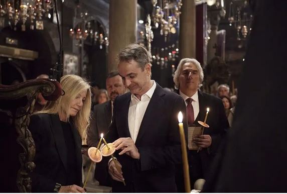 Μάλιστα, το πρωί του Μ. Σαββάτου 19/4, ο Πρωθυπουργός παρακολούθησε τη Θεία Λειτουργία της πρώτης Αναστάσεως στον Ιερό Ναό Ευαγγελιστρίας Τήνου, ενώ συνοδευόμενος από τη σύζυγό του Μαρέβα Γκραμπόφσκι - Μητσοτάκη, παρακολούθησε τη Μ. Παρασκευή την Ακολουθία και Περιφορά του Επιταφίου.