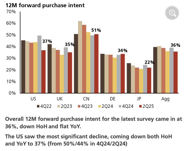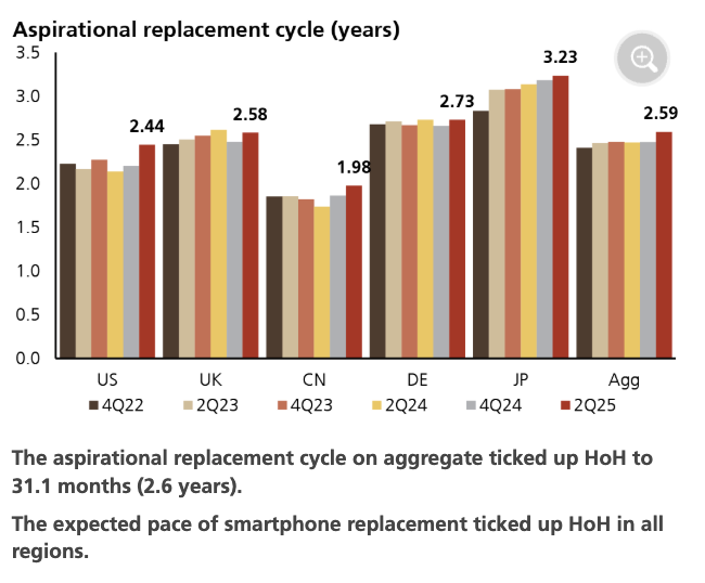 Σύμφωνα με την έρευνα της UBS Evidence Lab για το 2ο τρίμηνο του 25 σε 7.500 καταναλωτές σε πέντε χώρες (ΗΠΑ/ΗΒ/Γερμανία/Ιαπωνία/Κίνα), η 12μηνη πρόθεση αγοράς smartphone έπεσε από 36% το 2ο τρίμηνο του 25 από 39% το 4ο τρίμηνο του 24, σταθερά σε ετήσια βάση.