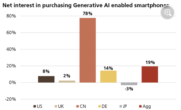 Το ενδιαφέρον για τα Generative AI-enabled smartphones αυξήθηκε στο 19% από 16% το 4ο τρίμηνο του 24), με την Κίνα να δείχνει τον μεγαλύτερο ενθουσιασμό σε ποσοστό 78%. Η Ιαπωνία ήταν η μόνη περιοχή με αρνητικό καθαρό ενδιαφέρον, ενώ οι ΗΠΑ είχαν μόνο 8%.