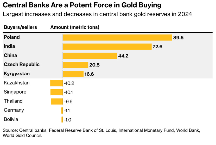 • την National Bank of Poland, τον μεγαλύτερο αγοραστή του 2024, με 90 τόνους, στοχεύοντας ώστε ο χρυσός να αντιστοιχεί στο 20–30% των συνολικών αποθεμάτων της•