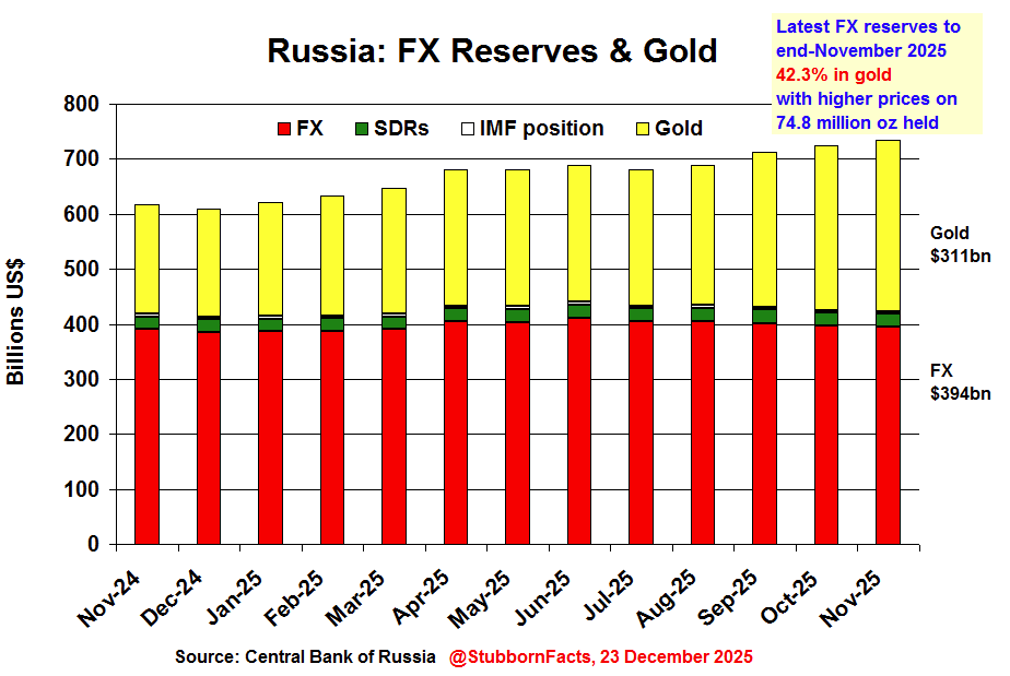Ταυτόχρονα, η ταχεία άνοδος των τιμών του χρυσού τα τελευταία χρόνια έχει μετριάσει την απώλεια εκείνου του μέρους των αποθεμάτων που πάγωσε η Δύση.