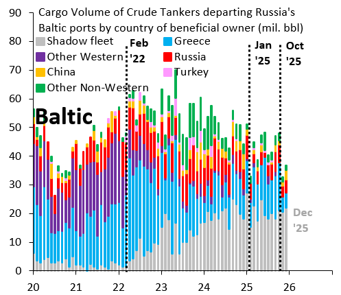 Η διατάραξη των θαλάσσιων μεταφορών αυξάνει το κόστος πώλησης πετρελαίου για τη Ρωσία, καθώς η χώρα εξαρτάται κρίσιμα από το θαλάσσιο εμπόριο και τις ανοικτές θαλάσσιες οδούς.