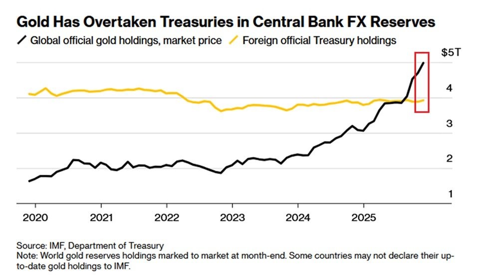 Σύμφωνα με την ίδια, η συνολική αξία των αποθεμάτων σε χρυσό των κεντρικών τραπεζών μέχρι το τέλος Δεκεμβρίου 2025 πλησίασε τα 4 τρισεκατομμύρια δολάρια, ξεπερνώντας τον όγκο των παγκόσμιων επενδύσεων σε αμερικανικά κρατικά ομόλογα.