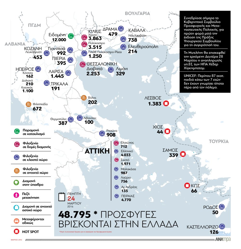 Μειώθηκε περιέργως (τα σύνορα των γειτόνων μας είναι κλειστά…) σήμερα 24/3 ο αριθμός προσφύγων και μεταναστών στην Ελλάδα, φτάνοντας τους 48.795, σύμφωνα με τα επίσημα στοιχεία των ελληνικών αρχών, από 49.085 που ήταν χθες.