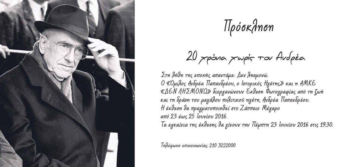 Έκθεση φωτογραφίας, με αφορμή τη συμπλήρωση 20 χρόνων από το θάνατο του Ανδρέα Παπανδρέου, διοργανώνουν στο Ζάππειο Μέγαρο ο «Όμιλος Ανδρέα Παπανδρέου, ο Ιστορικός Ηγέτης» και η ΑΜΚΕ «ΔΕΝ ΛΗΣΜΟΝΩ», με τα εγκαίνια να πραγματοποιούνται σήμερα Πέμπτη (23/6) στις 19:30, ενώ η έκθεση θα διαρκέσει μέχρι και το ερχόμενο Σάββατο (25/6).