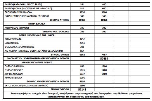 Τέλος, στους χώρους που διαχειρίζεται η Ύπατη Αρμοστεία του ΟΗΕ φιλοξενούνται 6.562 πρόσφυγες, ενώ εκτιμάται ότι 1.500 βρίσκονται εκτός δομών φιλοξενίας.
