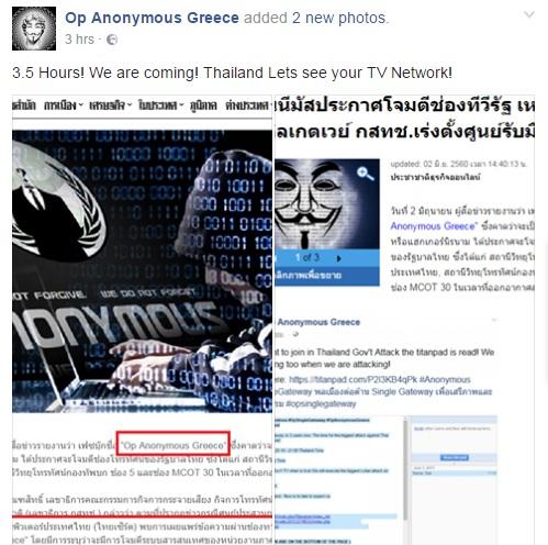 Έλληνες «Anonymous» απειλούν τις τελευταίες ώρες να «επιτεθούν» στο κρατικό κανάλι της Ταϊλάνδης, αλλά και στο κανάλι του στρατού, με αποτέλεσμα να έχει σημάνει συναγερμός στο γραφείο της τοπικής Εθνικής Επιτροπής Τηλεπικοινωνιών.