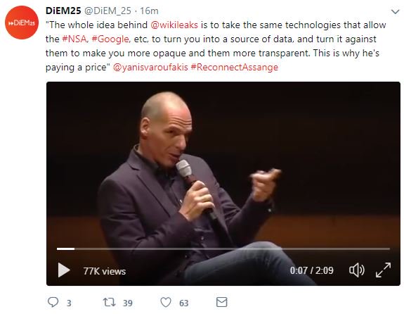 Αυτό πληρώνει (σσ: ο Julian Assange)», έγραψε στο Twitter το κίνημα DiEM25, με το hashtag «#ReconnectAssange», παραθέτοντας το βίντεο από την ομιλία του κ. Βαρουφάκη.