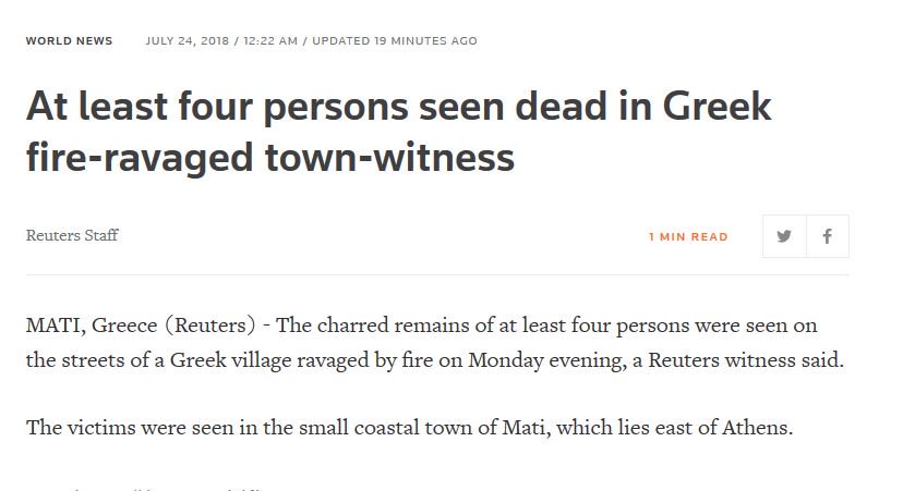 Τα απανθρακωμένα πτώματα τουλάχιστον τεσσάρων ανθρώπων εντοπίστηκαν στους δρόμους του χωριού Μάτι, το οποίο πλήττεται από τη μεγάλη πυρκαγιά στην ανατολική Αττική, σύμφωνα με αυτόπτη μάρτυρα που επικαλείται το πρακτορείο Reuters.