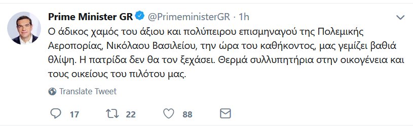 Η πατρίδα δεν θα τον ξεχάσει. Θερμά συλλυπητήρια στην οικογένεια και τους οικείους του πιλότου μας» έγραψε ο πρωθυπουργός, Αλέξης Τσίπρας, σε ανάρτηση του στο twitter για τον θάνατο του κυβερνήτη του στρατιωτικού αεροσκάφους.