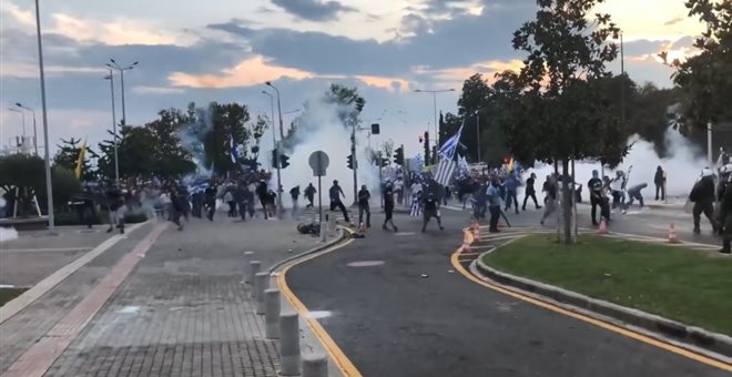 (upd7) Επεισόδια και ένταση καταγράφηκαν σήμερα (8/9) στη Θεσσαλονίκη κοντά στο δημαρχείο στο περιθώριο του συλλαλητηρίου για το Μακεδονικό, καθώς ομάδα περίπου 50 ατόμων επιτέθηκαν με καδρόνια και κράνη κατά των αστυνομικών με στόχο να προσεγγίσει το Βελλίδειο συνεδριακό κέντρο, όπου έλαβε χώρα η ομιλία του Αλέξη Τσίπρα στην 83η ΔΕΘ.