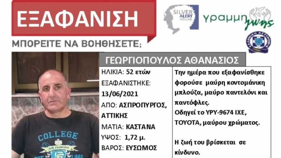 Συναγερμό σήμανε η ΓΡΑΜΜΗ ΖΩΗΣ για τον Αθανάσιο Γεωργιόπουλο που εξαφανίστηκε την 13/06 από το σπίτι του, στον Ασπρόπυργο Αττικής.