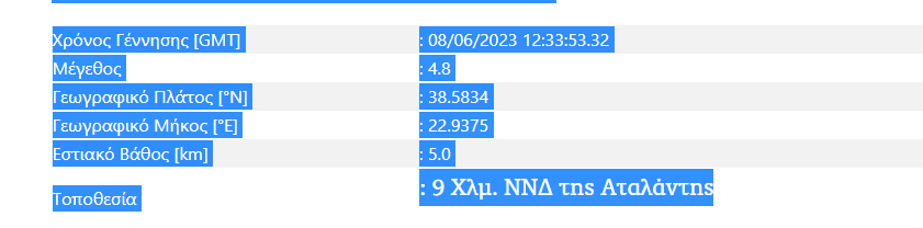 ύμφωνα με το Γεωδυναμικό Ινστιτούτο, το επίκεντρο της δόνησης εντοπίζετυαι 13 χιλιόμετρα νοτιοδυτικά της Αταλάντης