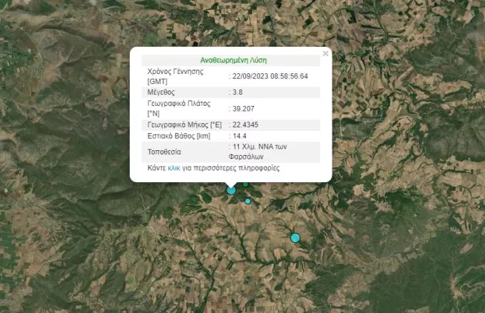 Σεισμός μέγεθος 3.8 βαθμών της Κλίμακας Ρίχτερ σημειώθηκε πριν λίγο στα Φάρσαλα, σύμφωνα με το Γεωδυναμικό Ινστιτούτο του Αστεροσκοπείου Αθηνών,
