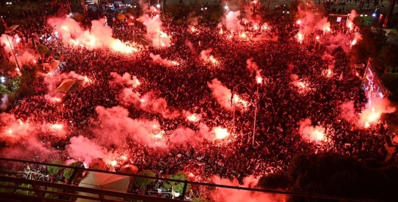 Πάνω από 400.000 βρέθηκαν στην πλατεία Κοραή και το Δημοτικό Θέατρο του Πειραιά για να παρακολουθήσουν τον τελικό στις γιγαντοοθόνες και να πανηγυρίσουν στη φιέστα που ακολούθησε, με την αποστολή της ομάδας να καταφτάνει με ανοιχτό λεωφορείο τα ξημερώματα.