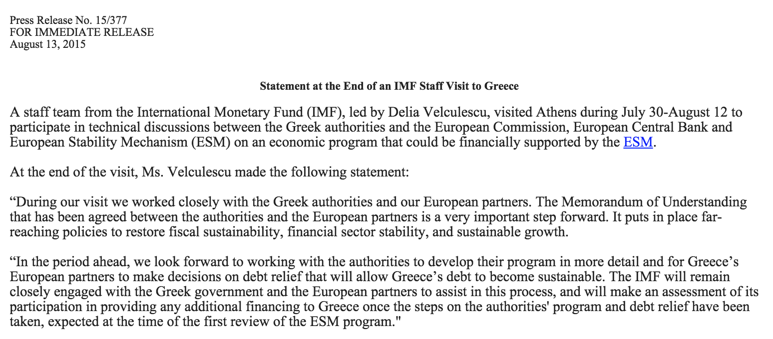 Ειδικότερα, η εκπρόσωπος του Ταμείου στην Ελλάδα, Delia Velculescu, υποστήριξε ότι η απόφαση για τη συμμετοχή του ΔΝΤ στο τρίτο πακέτο βοήθειας θα ληφθεί κατόπιν των πρώτων βημάτων εφαρμογής του προγράμματος και της αναδιάρθρωσης του ελληνικού χρέους.