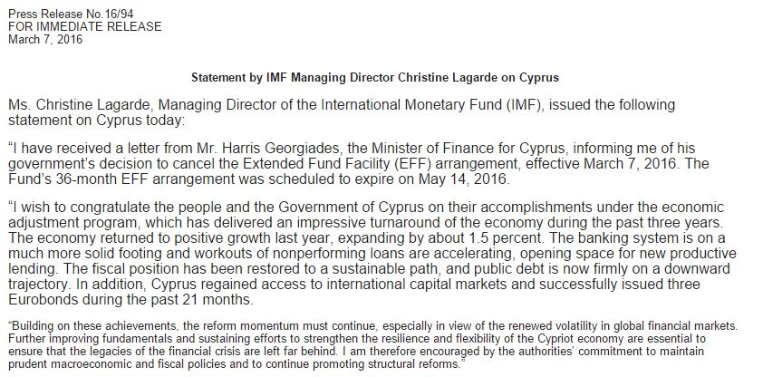 Το Eurogroup επαινεί την Κύπρο για τις προσπάθειες που κατέβαλλε για την επιτυχή εφαρμογή του μνημονίου ανέφερε ο ευρωπαίος επίτροπος.