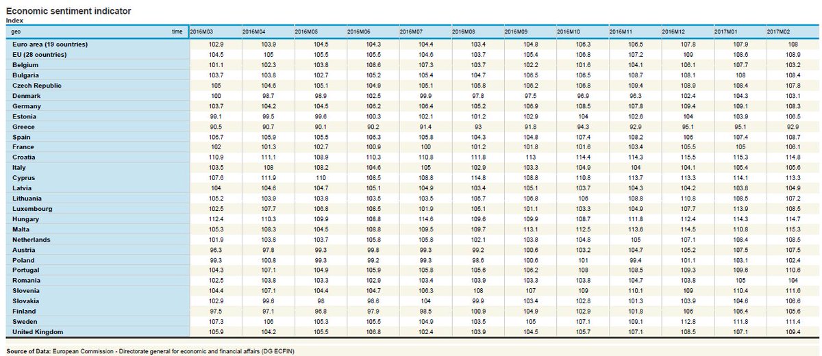 Αντίστοιχα, στην Ευρωζώνη το οικονοµικό κλίµα παραµένει εν πολλοίς αµετάβλητο (+0,1),τον Φεβρουάριο, φθάνοντας στις 108 µονάδες, ενώ στην ΕΕ ενισχύθηκε (+0,3), στις 108,9 µονάδες.