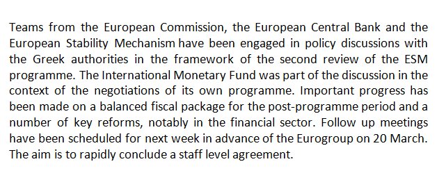 Όπως αναφέρεται, «ομάδες της Κομισιόν, της Ευρωπαϊκής Κεντρικής Τράπεζας και του Ευρωπαϊκού Μηχανισμού Σταθερότητας (ESM) έχουν εμπλακεί σε συζητήσεις με τις ελληνικές αρχές στο πλαίσιο της δεύτερης αξιολόγησης του προγράμματος του ESM», ενώ επισημαίνεται πως «το Διεθνές Νομισματικό Ταμείο συμμετείχε στις συζητήσεις στο πλαίσιο των διαπραγματεύσεων για το δικό του πρόγραμμα».