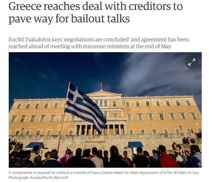 «Η Ελλάδα καταλήγει σε συμφωνία με τους δανειστές, ανοίγοντας το δρόμο για τις συνομιλίες που αφορούν τη διάσωση» μεταδίδει ο Guardian, αναφερόμενος στη συμφωνία με τους θεσμούς.