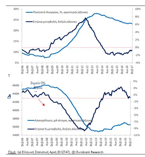 Το εποχικά προσαρμοσμένο ποσοστό ανεργίας, δηλαδή ο λόγος των ανέργων ως προς το εργατικό δυναμικό (εργατικό δυναμικό = άνεργοι + απασχολούμενοι) σημείωσε οριακή μηνιαία πτώση τον Φεβρουάριο 2017. Διαμορφώθηκε στο 23,2% από 23,3% τον Ιανουάριο 2017 και 23,9% τον Φεβρουάριο 2016.