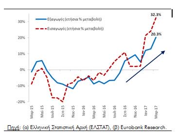 Τα αντίστοιχα μεγέθη για τις εισαγωγές ήταν 30,2% και 14,3%. Σύμφωνα με τα στοιχεία εμπορευματικών συναλλαγών της ελληνικής στατιστικής αρχής (ΕΛΣΤΑΤ), οι εξαγωγές εμπορευμάτων σημείωσαν θετική ετήσια μεταβολή για 8ο συνεχή μήνα τον Μάρτιο 2017 (25,7%)