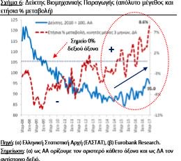 Συνεχίστηκε για 12ο συνεχή μήνα (Μάρτιος 2017) η ετήσια αύξηση της βιομηχανικής παραγωγής (8,5% από 10,9% τον Φεβρουάριο 2017). Σε όρους μηνιαίας μεταβολής καταγράφηκε πτώση -2,0% από -0,4% τον προηγούμενο μήνα.