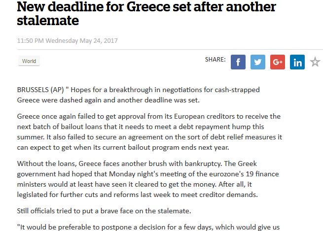 Η ελπίδα για το κλείσιμο της β' αξιολόγησης για την Ελλάδα μετατέθηκε εκ νέου καθώς ούτε στο τελευταίο Eurogroup βρέθηκε η χρυσή τομή μεταξύ της Αθήνας και των πιστωτών της. Η Ελλάδα απέτυχε για άλλη μια φορά να πάρει την έγκριση από τους ευρωπαίους πιστωτές της για να λάβει την επόμενη δόση των δανείων διάσωσης που χρειάζεται για να αντιμετωπίσει τις πληρωμές που έχει να κάνει τον Ιούλιο, αλλά ούτε και χρονοδιάγραμμα για την ελάφρυνση του χρέους.