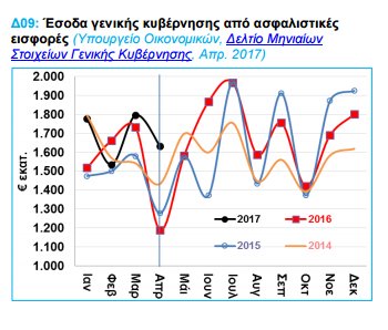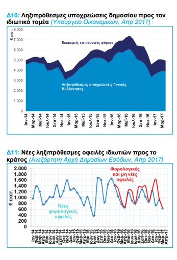 Παράλληλα, οι ληξιπρόθεσμες οφειλές του δημοσίου, αν και περιορίστηκαν κατά €117 εκατ. τον Απρίλιο του 2017, διαμορφώνονται σε €5 δισ. περίπου, έναντι €4,6 δισ. τον Δεκέμβριο του 2016.