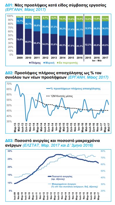 Η βελτίωση της πορείας της οικονομίας το πρώτο τρίμηνο του 2017 αποτυπώνεται και στην περαιτέρω υποχώρηση του ποσοστού ανεργίας, το οποίο μειώθηκε στο 22,5% τον Μάρτιο του 2017, ενώ οι μισθοί σε σταθερές τιμές εμφάνισαν πτώση το 1ο τρίμηνο του 2017 (-0,4%) για πρώτη φορά από το 2ο τρίμηνο του 2014, κυρίως λόγω της ανόδου των τιμών (+1,4% το 1ο τρίμηνο του 2017), καθώς σε τρέχουσες τιμές παρουσίασαν άνοδο (+1%) για έκτο συνεχόμενο τρίμηνο. Παράλληλα, η βιομηχανική παραγωγή και οι εξαγωγές έχασαν μέρος της δυναμικής τους τον Απρίλιο (-1,6% η παραγωγή στη μεταποίηση πλην πετρελαιοειδών και -4% οι εξαγωγές αγαθών πλην καυσίμων και πλοίων έπειτα από άνοδο +4,9% και +6,2% αντίστοιχα το 1ο τρίμηνο του 2017), καθώς η καθυστέρηση της 2ης αξιολόγησης επιδρά αρνητικά στο οικονομικό κλίμα.