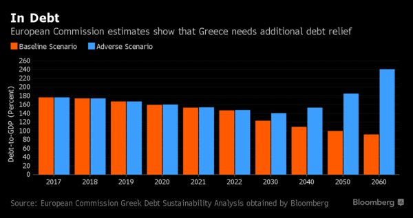 Επίσης αναφέρεται ότι ακόμα και στο βασικό σενάριο, η ελάφρυνση του ελληνικού χρέους είναι απαραίτητη, καθώς οι χρηματοδοτικές ανάγκες θα ξεπεράσουν το 20% μετά το 2045.