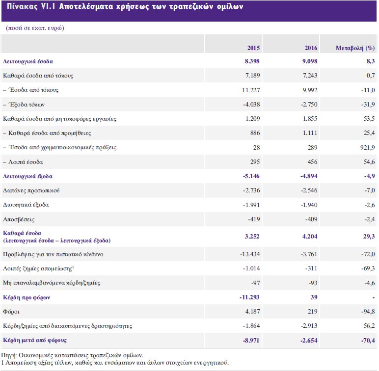 Το 2016 οι εγχώριες τράπεζες κατέγραψαν κέρδη προ φόρων, σε σύγκριση με ζημίες κατά τις αμέσως προηγούμενες χρονιές, ενώ μειώθηκε ελαφρώς το υπόλοιπο των μη εξυπηρετούμενων δανείων.