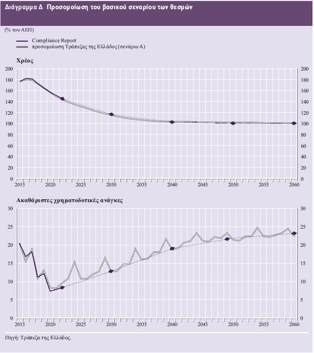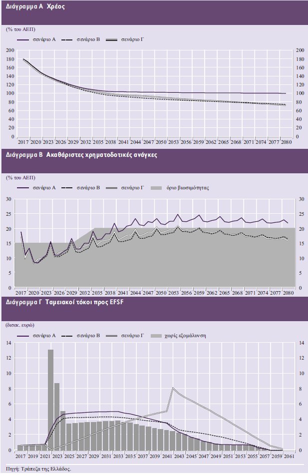 Σύμφωνα με τις παραπάνω παραδοχές, το βασικό σενάριο των θεσμών οδηγεί σε σταθεροποίηση του λόγου χρέους προς ΑΕΠ σε περίπου 100% από το 2060 και έπειτα (βλ. Διάγραμμα Α).
