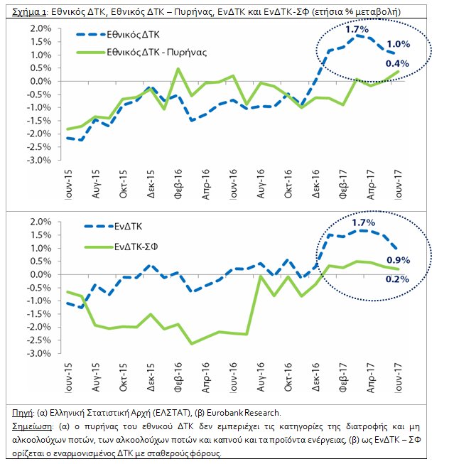 Ο πληθωρισμός βάσει του πυρήνα του εθνικού ΔΤΚ, δηλαδή η ετήσια ποσοστιαία μεταβολή του εθνικού ΔΤΚ χωρίς τη συμμετοχή των κατηγοριών της διατροφής και μη αλκοολούχων ποτών, των αλκοολούχων ποτών και καπνού και των προϊόντων ενέργειας, διαμορφώθηκε στο 0,4% τον Ιούνιο 2017 από 0,0% τον Μάιο 2017 και 0,2% τον Μάιο 2016.