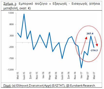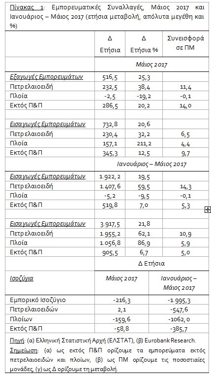 Βάσει των παραπάνω στοιχείων, η ετήσια μείωση του εμπορικού ισοζυγίου κατά -€216,3 εκατ. τον Μάιο 2017 προήλθε κυρίως από τη μείωση του ισοζυγίου των πλοίων κατά -€159,6 εκατ.