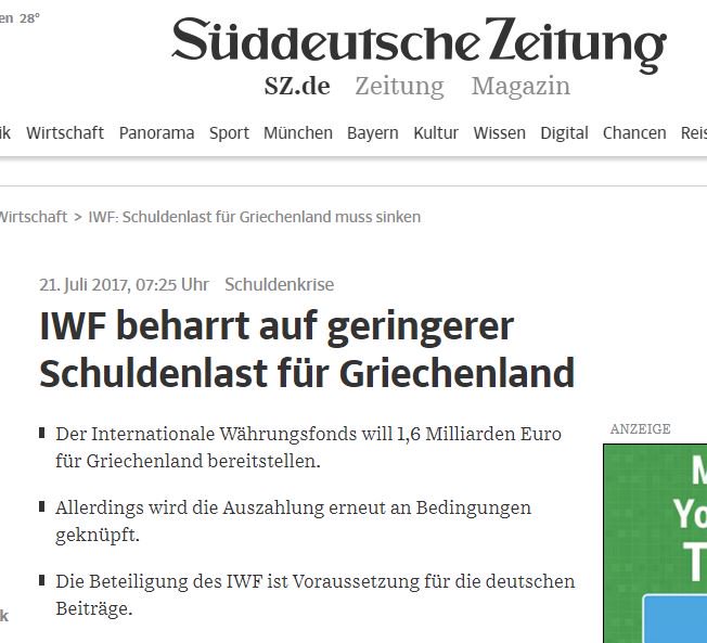 Στα περί «ταβανιού» από το ΔΝΤ όσον αφορά στο ελληνικό χρέος αναφέρεται σε σημερινό (21/7/2017) δημοσίευμα η Suddeutsche Zeitung.