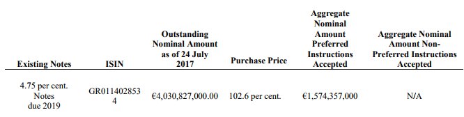 Στα 1.574.357.000 ευρώ διαμορφώνεται το ποσό που άντλησε το ελληνικό Δημόσιο από την προσφορά ανταλλαγής κι επαναγοράς του 5ετούς ομολόγου (με ωριμότητα το 2019), σύμφωνα με όσα ανακοίνωσε επίσημα σήμερα (25 Ιουλίου 2017) η κυβέρνηση.