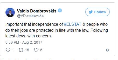 Αναλυτικότερα στην ανάρτησή του ο κ. Dombrovskis αναφέρει χαρακτηριστικά «είναι σημαντικό η ανεξαρτησία της ΕΛΣΤΑΤ και των ανθρώπων που κάνουν τη δουλειά τους να προστατεύονται σύμφωνα με τον νόμο. Παρακολουθούμε τις τελευταίες εξελίξεις με ανησυχία».