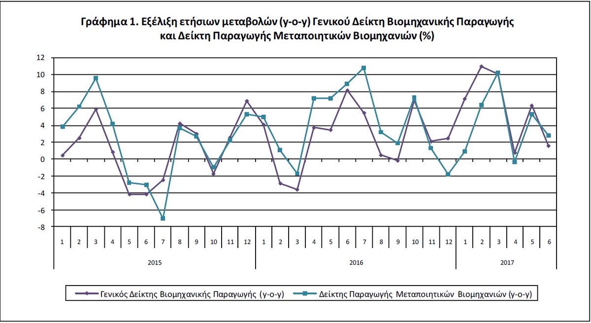 Σύμφωνα με τα στοιχεία της ΕΛΣΤΑΤ, ο μέσος Γενικός Δείκτης Βιομηχανικής Παραγωγής της περιόδου Ιανουαρίου - Ιουνίου 2017, σε σύγκριση με τον αντίστοιχο δείκτη της περιόδου Ιανουαρίου - Ιουνίου 2016, παρουσίασε αύξηση 6%.