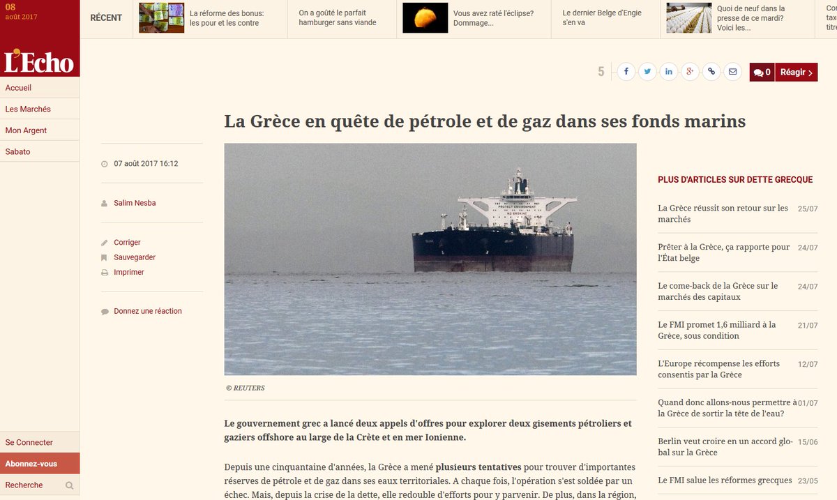 Στην προκήρυξη των δύο διεθνών διαγωνισμών για την παραχώρηση δικαιώματος έρευνας και εκμετάλλευσης υδρογονανθράκων στο Ιόνιο και την Κρήτη αναφέρεται σημερινό ρεπορτάζ της βελγικής εφημερίδας L' Echo, υπό τον τίτλο «Η Ελλάδα ψάχνει για πετρέλαιο και αέριο στο βυθό της θάλασσας».