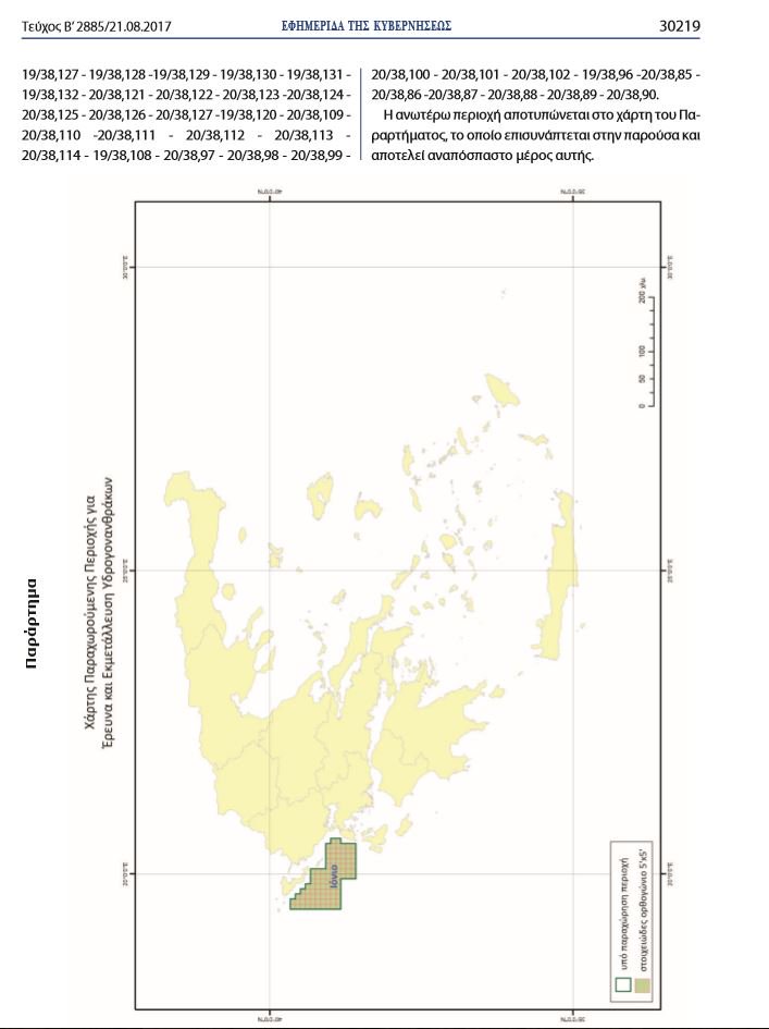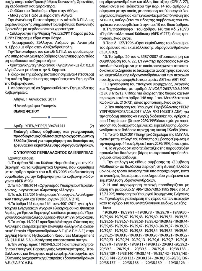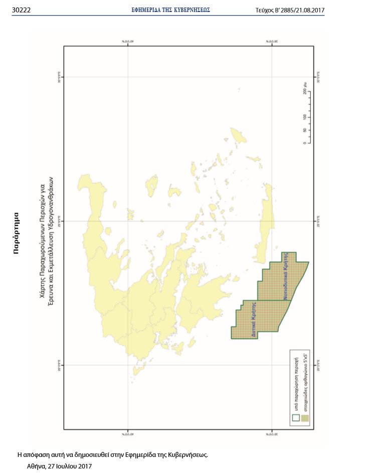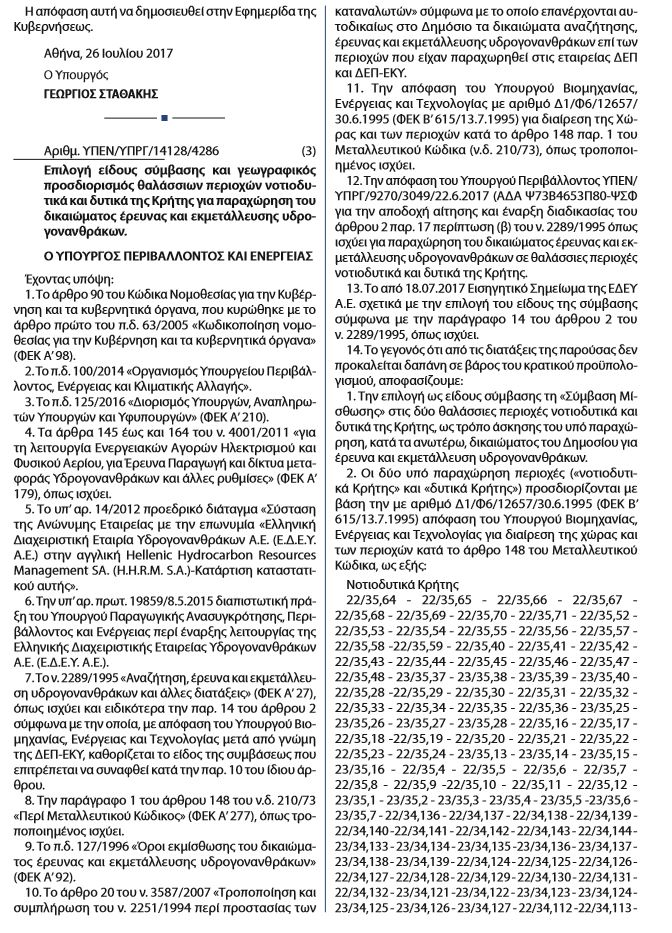 Δημοσιεύθηκαν στην Εφημερίδα της Κυβερνήσεως (Β2885-21/8/2017) οι αποφάσεις του υπουργού Περιβάλλοντος και Ενέργειας Γιώργου Σταθάκη για την επιλογή είδους σύμβασης και τον γεωγραφικό προσδιορισμό θαλασσίων περιοχών στη δυτική Ελλάδα (Ιόνιο) και την Κρήτη, για παραχώρηση του δικαιώματος έρευνας και εκμετάλλευσης υδρογονανθράκων.