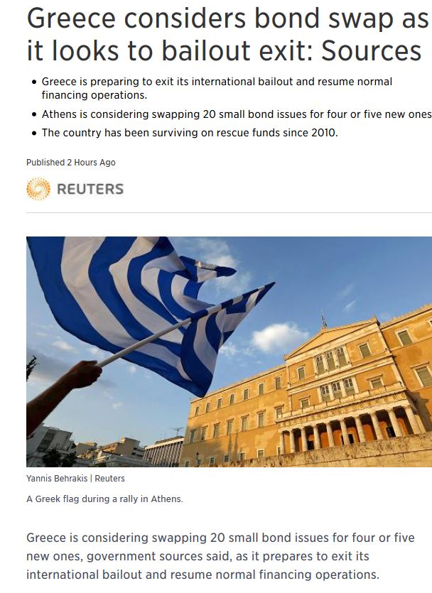 (upd) Η Ελλάδα εξετάζει το ενδεχόμενο της ανταλλαγής 20 μικρών ομολόγων με την έκδοση τεσσάρων ή πέντε νέων εκδόσεων σύμφωνα με κυβερνητικές πηγές που επικαλείται δημοσίευμα του Reuters, καθώς προετοιμάζεται για την έξοδό της στις αγορές μετά την ολοκλήρωση του τρέχοντος προγράμματος διάσωσης που ολοκληρώνεται τον Αύγουστο του 2018.
