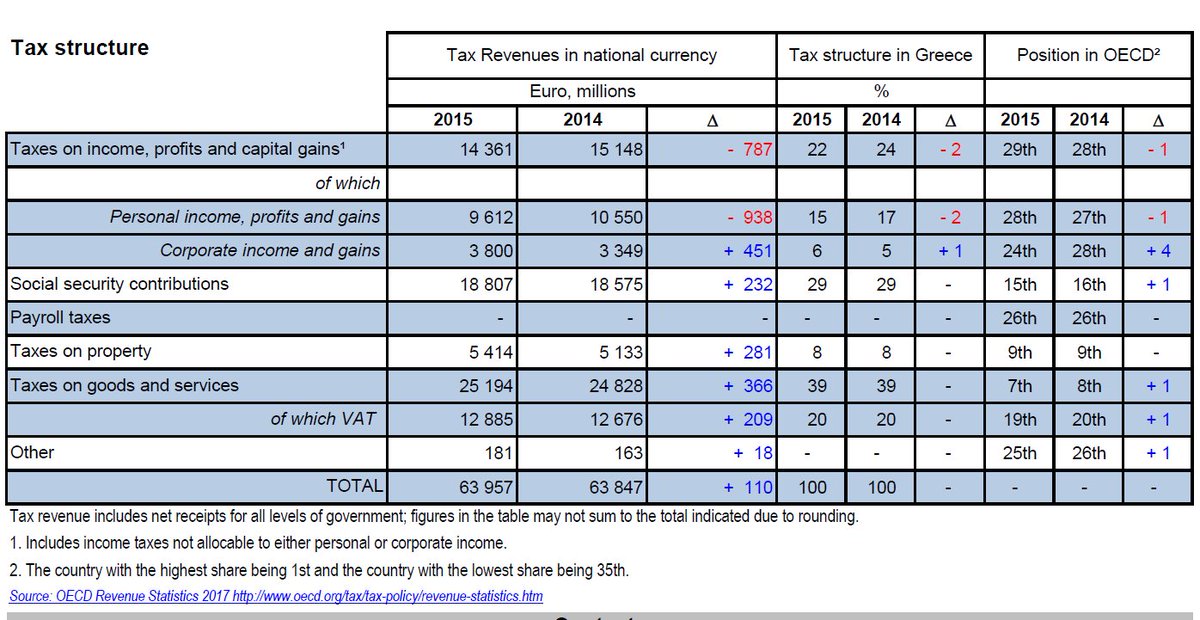Ειδικότερα, στην Ελλάδα στα 100 ευρώ εσόδων από φόρους και ασφαλιστικές εισφορές, οι εισφορές συνδράμουν με 29 ευρώ (26 ο μέσος όρος στον ΟΟΣΑ), έμμεσοι φόροι είναι στα 39 ευρώ (32 ο μέσος όρος), η συμμετοχή των εταιρικών φόρων είναι στα 6 ευρώ (έναντι 9 στον ΟΟΣΑ) και οι φόροι στην περιουσία δίνουν 8 ευρώ ( έναντι 6 στον ΟΟΣΑ).