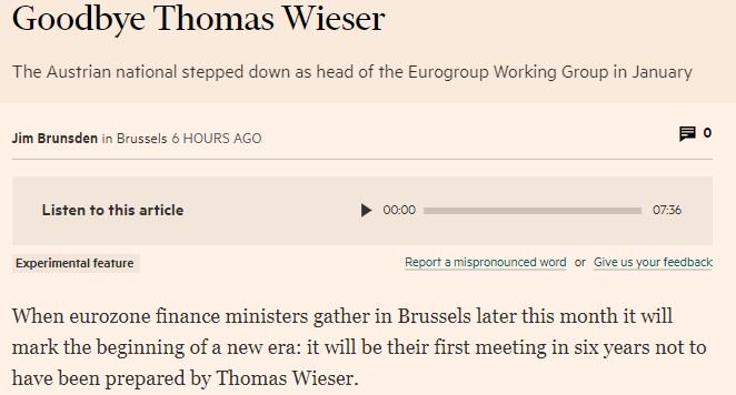 Όπως σχολιάζουν οι Financial Times, η επικείμενη συνάντηση των υπουργών Οικονομικών της ευρωζώνης, αργότερα αυτόν τον μήνα, θα είναι η αρχή μίας νέας εποχής, καθώς θα είναι η πρώτη συνάντηση εδώ και έξι χρόνια που δεν θα έχει προετοιμαστεί από τον Wieser.