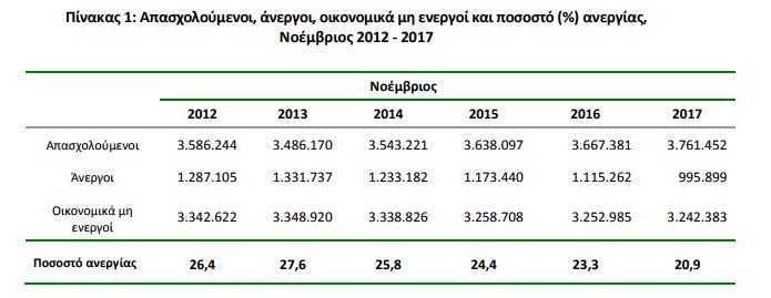 Οι οικονομικά μη ενεργοί, μειώθηκαν κατά 10.602 άτομα σε σχέση με το Νοέμβριο του 2016 (-0,3%) ενώ αυξήθηκαν κατά 7.062 άτομα σε σχέση με τον Οκτώβριο του 2017 (+0,2%).