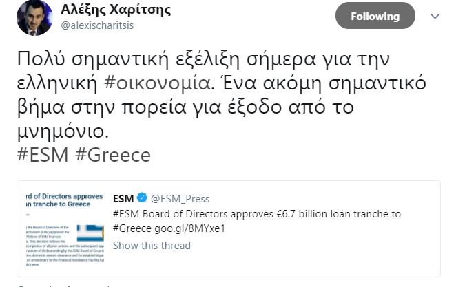 Ο αναπληρωτής υπουργός Οικονομίας, Αλέξης Χαρίτσης, σχολίασε την απόφαση του ESM για εκταμίευση της δόσης προς την Ελλάδα