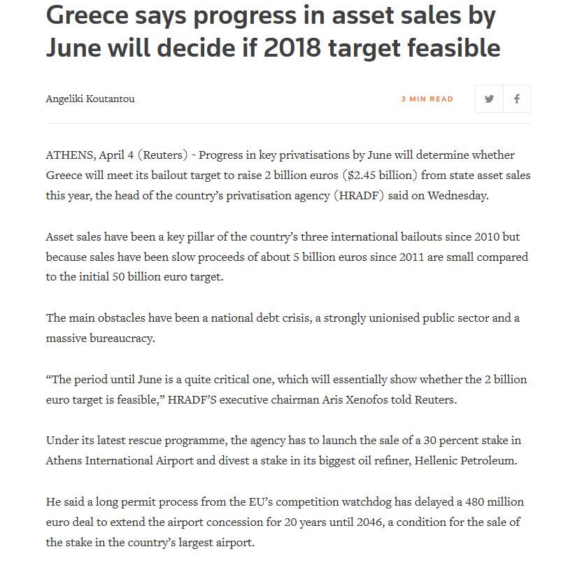 Οι πωλήσεις περιουσιακών στοιχείων αποτέλεσαν βασικό πυλώνα των τριών πακέτων διάσωσης της Ελλάδας από το 2010, ωστόσο οι πωλήσεις έχουν αποφέρει περίπου 5 δισ. ευρώ από το 2011 και τα έσοδα είναι πολύ χαμηλά σε σύγκριση με τον αρχικό στόχο των 50 δισ. ευρώ.